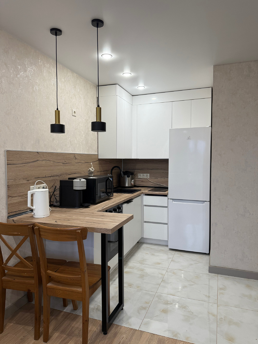 Мои дорогие! Еще летом я обещала сделать обзор итого ремонта однушки в Одинцово. Но получилось выполнить обещанное только сейчас. Вначале мне не позволяли это сделать мелкие недоделки, затем - отсутствие идеального порядка: то студент носки раз бросает, то мусор не вынесет)) В итоге я слегка наехала на всех, потребовала повесить последнюю полку, шторы и убрать куртку в шкаф. После выполнения сих действий я сделала фотографии. Кухня, которая находится в нише. Цвет белый, столешница под дерево. Есть вся необходимая техника: от холодильника, до мультиварки: Холодильник привезла из своей квартиры, а себе купила новый: Микроволновка и чайник из моих запасов, мультиварка тоже: стулья нам пожертвовали, но я хочу купить еще два барных стула. На Авито нашла подходящие, но продавец пока молчит Гостиная: Все, кроме дивана, из старых запасов. Небольшой письменный стол IKEA, ковёр, полка? Журнальный столик тоже оттуда. Вид на кухонный уголок и жилую зону: Есть вместительный шкаф для одежд