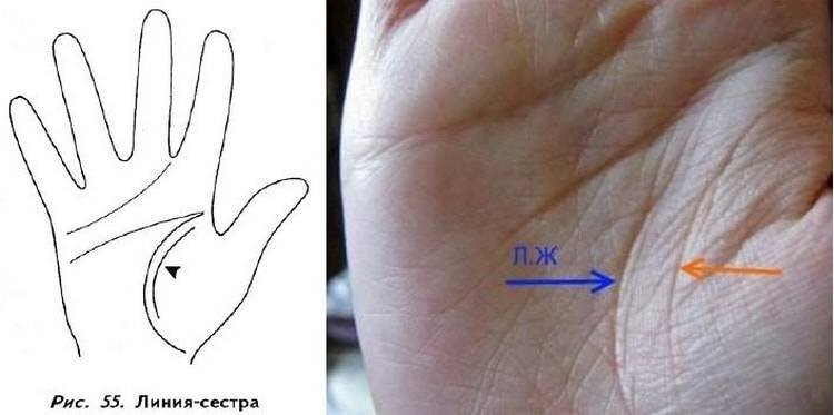 Известна в трудах по хиромантии под названием ЛИНИЯ СЕСТРА, ЛИНИЯ АНГЕЛА-ХРАНИТЕЛЯ, ВНУТРЕННЯЯ ЛИНИЯ ЖИЗНИ. Названий много, суть одна - дополнительный энергетический потенциал человека, поддержка рода, близких людей. Люди, обладающие этой линией как правило довольно активны, т.к. наделяются качествами Марса - способностью к борьбе, достижению целей и отстаивание своих позиций.