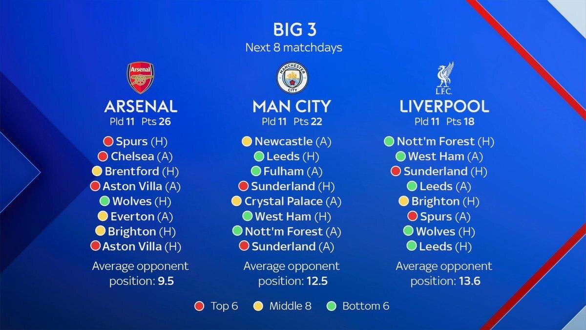 Ближайшие восемь матчей Премьер-Лиги для "Арсенала", "Манчестер Сити" и "Ливерпуля" ☝️