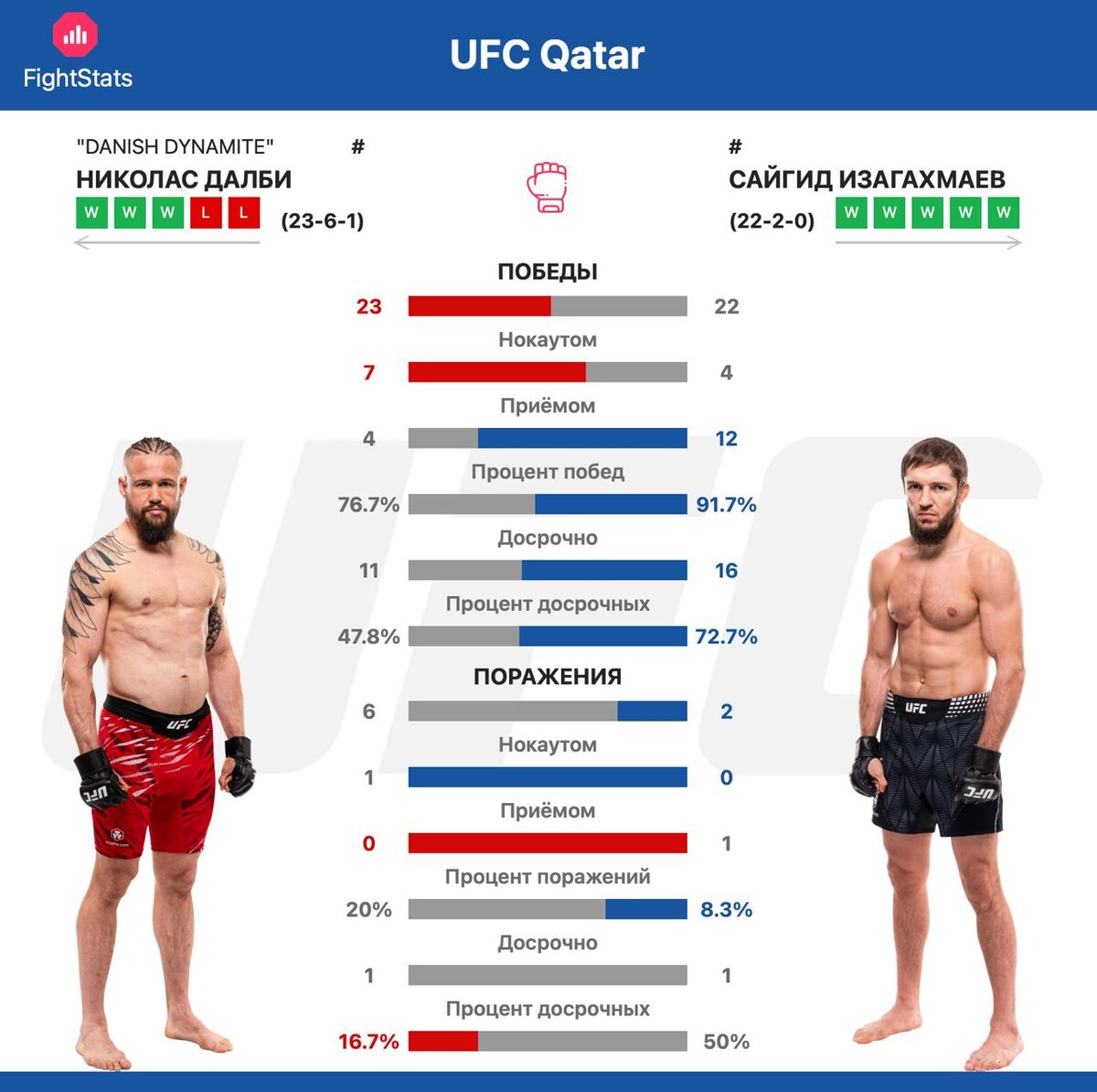 Николас Далби: • 23 победы в карьере (7 нокаутов, 4 приёма); • процент побед — 76,7%; • 11 досрочных побед (процент досрочных — 47,8%); • имеет серию из двух поражений — тревожный сигнал перед боем; • силён в стойке (каратэ-основа), но уязвим в партере. Сайгид Изагахмаев: • 22 победы (12 сабмишенами — его коронный приём); • впечатляющий процент побед — 91,7%; • 16 досрочных побед (процент досрочных — 72,7%); • всего 2 поражения в карьере; • специализируется на грэпплинге и контроле соперника. Ключевые факторы поединка: • Стойка vs. партер: Далби будет стараться удерживать бой в стойке, Изагахмаев — переводить в партер. • Темп: россиянин может задавить соперника непрерывным давлением. • Опыт vs. агрессия: 41-летний Далби против 31-летнего амбициозного дебютанта в UFC. • Выносливость: возраст Далби может стать фактором в затяжном бою. Прогноз: Бой обещает быть напряжённым, но стилистическое преимущество на стороне Сайгида Изагахмаева. Его доминирование в грэпплинге и высокий процент доср