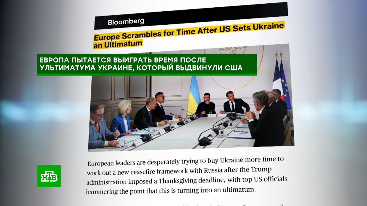 [ Смотреть видео на сайте НТВ ] Несмотря на жесткую позицию Вашингтона, Европа пытается переписать мирную сделку США, сообщает агентство Bloomberg со ссылкой на свои источники. По данным Bloomberg, лидеры ЕС вместе с Зеленским хотят незаметно внести существенные изменения в план Трампа до 27 ноября: Макрон и Мерц планируют фактически отредактировать основную часть документа в выгодном прежде всего для них свете, но представить это в качестве конструктивных поправок во благо Украины. Аналитики по всему миру указывают на патовое положение Киева. И ситуацию все больше усугубляют европейские советники Зеленского. В турецких СМИ прямо говорят — стоит ему засомневаться и вроде бы начать раздумывать над предложениями Вашингтона, как тут же в дело вмешиваются Макрон, Мерц, Стармер и начинают отговаривать Зеленского. А журналист турецкой газеты Sabah в статье под ярким заголовком «Прощай, Украина!» подробно расписывает и другие неудачи Киева — коррупционный скандал и тотальный провал на фронте.