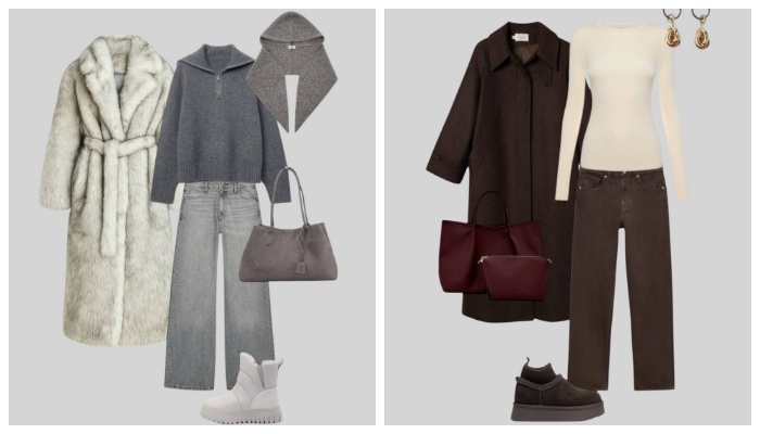 Современные образы позволяют сочетать комфорт, функциональность и эстетику, создавая комплекты, которые выглядят продуманно и гармонично. Сегодняшняя подборка сетов — отличный пример того, как можно комбинировать фактуры, цвета и силуэты, чтобы выглядеть модно в любую погоду. Первый сет сочетает глубокий бордовый оттенок пуховика с мягкими серыми оттенками свитера и широких брюк. Такой образ выглядит сдержанно и элегантно, а акцентная красная вязаная шапка добавляет живости и динамики. Серые аксессуары и грубые челси уравновешивают цветовую палитру и придают образу современный городской характер. Этот комплект строится на контрасте насыщенного оливкового свитера и тёплого коричневого пальто. Широкие брюки шоколадного оттенка продолжают тему натуральных цветов и подчёркивают силуэт. Замшевые ботильоны в тон пальто создают цельность, а необычные серьги добавляют индивидуальности — образ получается интеллигентным, стильным и очень актуальным. Сочетание фактуры и мягкой нейтральной палитр