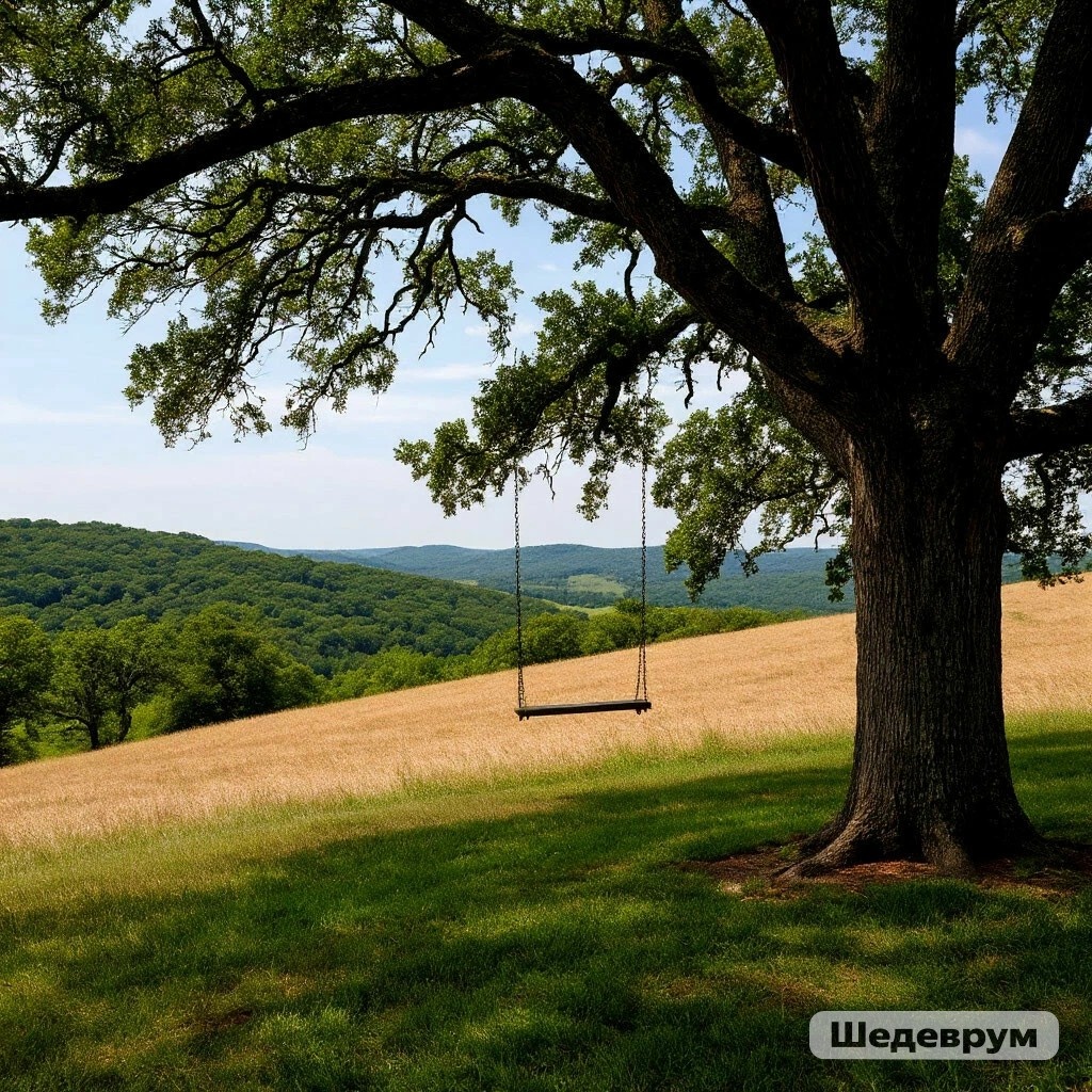 Мы сидим здесь до самого заката. Воздух пахнет теплом и чем-то очень живым-тем, чего так не хватает в городе. Ветер колышет траву, дуб бросает на нас длинную тень, а время словно замедляется. Мы молчим, но это хорошее молчание. Спокойное. Как будто все уже сказано и словами, и взглядами.
