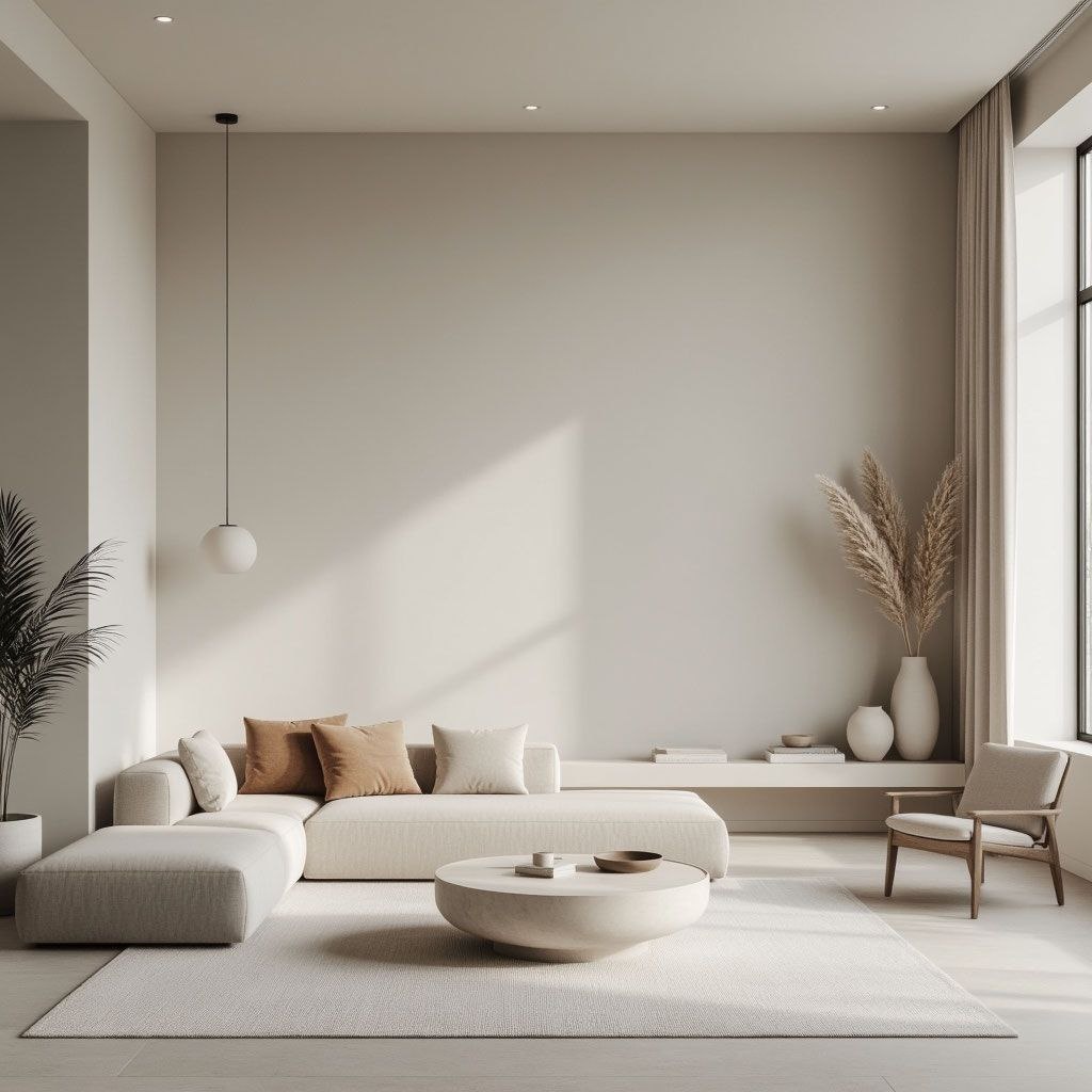 Пространство выполнено в эстетике современного минимализма, где каждая деталь подчёркивает спокойствие, гармонию и продуманность дизайна. Интерьер выполнен в мягкой нейтральной палитре: оттенки тёплого бежевого, светлого песочного и натурального дерева создают ощущение уюта и естественности. Низкий модульный диван лаконичных форм формирует зону отдыха и поддерживает горизонтальную динамику пространства. Акцентные подушки добавляют глубины и тактильных ощущений. В центре композиции — скульптурный журнальный столик округлой формы, который мягко связывает элементы интерьера. Большое панорамное окно наполняет комнату естественным светом, подчёркивая фактуру тканей и мебели. Лёгкие шторы и минималистичные светильники создают атмосферу лёгкости и визуальной чистоты. Декоративные элементы — сухоцветы, керамика, книги — расставлены деликатно, с чувством меры. Этот интерьер — воплощение спокойствия, воздушности и комфортного современного образа жизни, где функциональность сочетается с эстети