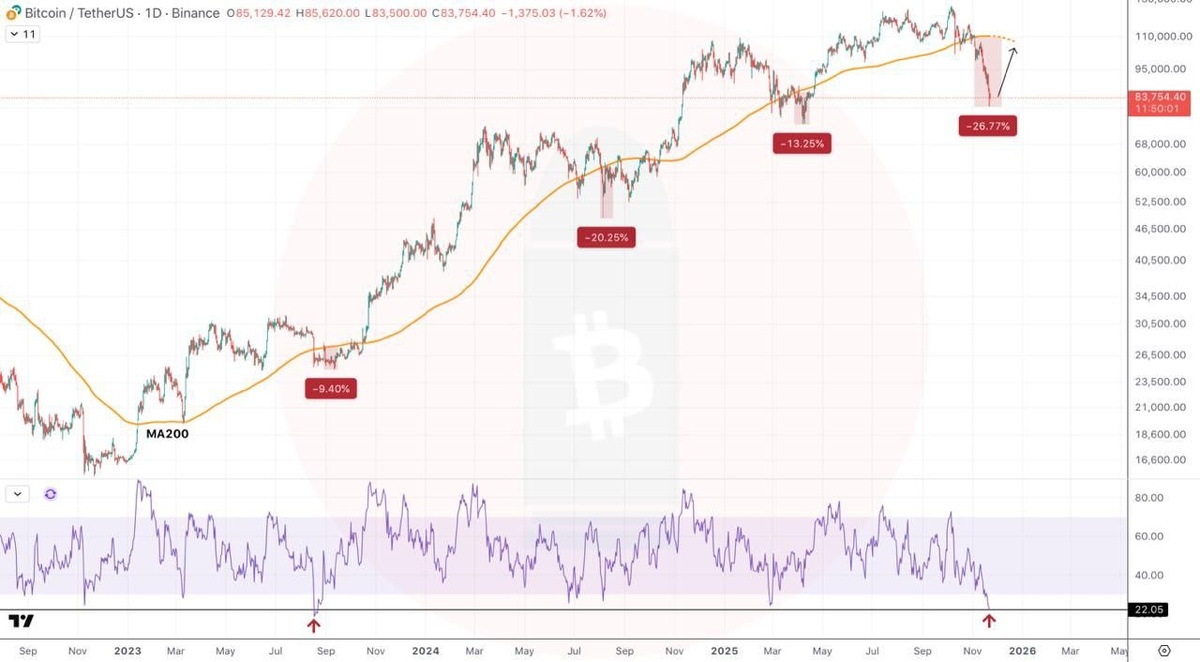 Это самое агрессивное снижение, которое мы видели в этом цикле на данный момент. #BTC цена на 26% ниже 200-дневной скользящей средней (Ранее 3 раза было -9%, -20% и -13%) И самый низкий RSI, который мы видели с августа 2023 года! В ближайшие пару месяцев нам придется отскочить обратно к MA200