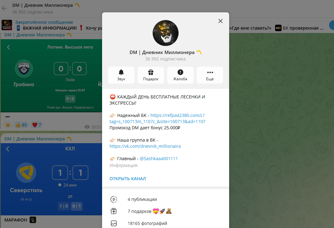 Перед нами типичный «попанский» проект, где рисуют статистику, накручивают аудиторию и работают по партнёрке букмекера. 👉 Кстати, если хотите реальный заработок, а не вот это всё — держите проверенный вариант. Канал существует с 2022 года, но успел несколько раз менять названия. Так обычно делают проекты, пытающиеся убежать от старых негативных отзывов. В Telegram — около 36 тысяч подписчиков, но просмотров смешно мало. В ВК — 176 тысяч, а активности почти ноль. Что это значит? Всё просто — накрутка. Боты есть, доверия — нет. Комментарии закрыты везде, и это тоже о многом говорит. Никто не мешает удалять неудобные вопросы и жалобы. Как и у большинства капп