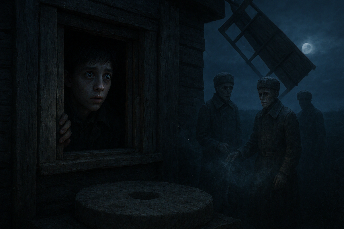 Мельница у Чёрного оврага стояла пустой уже полвека, но местные обходили её десятой дорогой. Говорили, что жернова там крутятся не от ветра и не от воды, а от тяжелых мыслей. Сказывали, что мельник там прежний, мёртвый, по старой привычке работу свою правит. Только мука у него особая – из горечи да из страхов человеческих. На отшибе, у самого оврага, чернел её остов. Крысам да ветрам в ней только и было дело. А через дорогу, в единственной избе, доживал свой век старый солдат Антип, что вернулся с войны без ноги. Жил он тихо, никого не трогал, только по ночам, бывало, кричал во сне – фронт снился. Как-то раз зашли к нему двое деревенских парней: Лёньша да Артём. Ребята хотели удалью перед девчатами похвастать – посмелей всех считались. — Дед, — говорят, — пусти переночевать в той мельнице. Спорим, что до утра не сбежим! Антип только покачал головой: — Не ходите, чертята. Не для живых там место. Но парни упёрлись. Старик вздохнул, глядя на них выцветшими глазами: — Ладно. Только слушайт