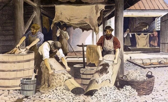 Деятельность кожевников была связано с долгим, многоэтапным и физически тяжелым трудом. Всё начиналось с получения сырья - шкур с боен или от павших животных. Эти шкуры сначала нужно было очистить от остатков мяса и жира, а затем предотвратить их разложение. Этот процесс назывался мездрением и для его облегчения шкуры на несколько дней замачивали в чанах с едкой щёлочью, которую получали, смешивая воду с пеплом или известью. После мездрения начинался самый зловонный этап - удаление волосяного покрова. Шкуры обрабатывали настоями собачьего или голубиного помёта, а иногда и мочой, которые благодаря высокому содержанию аммиака разъедали волосяные луковицы. Именно на этом этапе в воздухе над кожевенной мастерской начинал витать тот самый непередаваемый смрад, который становился визитной карточкой всего ремесла. После очистки следовал ключевой процесс - дубление. Шкуры дубили в растворах дубильной кислоты, получаемой из коры дуба или ивы, или же, что было дешевле, солями алюминия. Готовую кожу затем мяли, растягивали и мягчили, чтобы придать ей гибкость.