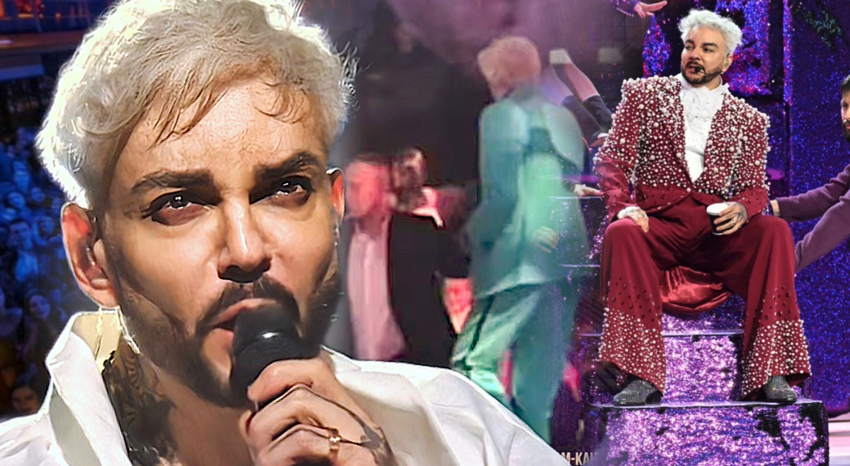 На сцене разворачивается впечатляющая картина: под бурные овации зрителей завершается выступление Филиппа Киркорова, неизменно поражающего публику экстравагантными костюмами. В момент, когда артист приближается к лестнице, возникает пауза, наполненная почти мифологическим напряжением - он словно античный герой на пороге опасного спуска в подземное царство.