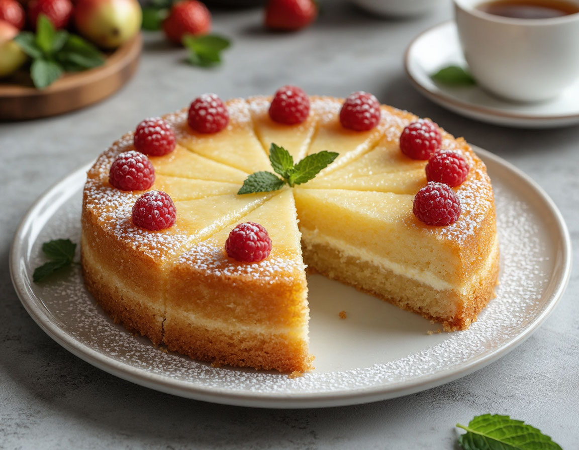 Манный пирог, пропитанный лимонным или апельсиновым сиропом. Получается влажный и ароматный. Украсить ягодами.