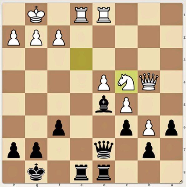 Решение шахматной задачи. Ошибочный ход белых создаёт почти идеальную выигрышную позицию для чёрных. Найдите лучшее продолжение за чёрных. Чёрные начинают и получают решающее преимущество. Chess problem solution. A perfect winning position for Black. Chess problem solution. A mistaken move by White creates an almost perfect winning position for Black. Find the best continuation for Black. Black to move and gain a decisive advantage: [Event "casual correspondence game"] [Site "https://lichess.org/yrztclge"] [Date "2025.11.16"] [White "lichess AI level 8"] [Black "_"] [Result "0-1"] [GameId "yrztclge"] [UTCDate "2025.11.16"] [UTCTime "05:43:39"] [WhiteElo "?"] [BlackElo "1500"] [Variant "From Position"] [TimeControl "-"] [ECO "?"] [Opening "?"] [Termination "Normal"] [FEN "3rr1k1/1p1q2pp/pPp2p2/2Pb4/1QNP4/8/5PPP/3RR1K1 b - - 1 27"] [SetUp "1"] [Annotator "lichess.org"] 27... Qg4 28. f3 Bxf3 29. Qd2 Bxd1 30. Rxe8+ Rxe8 31. h3 Qe2 32. Qxe2 Bxe2 33. Nd6 Re7 34. Kf2 Bb5 35. Nc8 Rd7 36. Nd