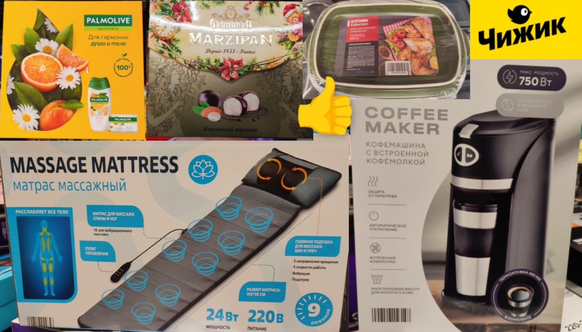 Приветствую! В Чижике каждый четверг пополнение товаров, завезли много полезных товаров для кухни, подарочные наборы, средства для ухода за собой и многое другое. Форма для запекания керамическая с крышкой, 1 л - 999 р. Кастрюля эмалированная 4 л - 899 р. Кастрюля эмалированная 2 л - 699 р. Кофемашина с встроенной кофемолкой - 3499 р. Матрас массажный электрический - 4499 р. Швабра паровая - 2999 р. Мультимедийная акустическая система с подсветкой - 1999 р. Выпрямитель для волос - 1199 р. Массажёр для лица - 999 р. Ирригатор для полости рта - 1699 р. Маска тканевая Garnier - 119 р. Спрей-антистатик для волос - 139 р. Детский шампунь и гель для душа 2 в 1 - 169 р. Подарочный набор "Бархатные ручки" 3 миникрема для рук - 149 р. Подарочный набор Palmolive (гель для душа и мыло) - 299 р. Подарочный набор бомбочек для ванны 2 шт. - 249 р. Бомбочка для ванны - 139 р. Жемчуг для ванны - 169 р. Подарочный набор (арахисовая паста и мини батончики) - 449 р. Конфеты марципановые - 299 р.
