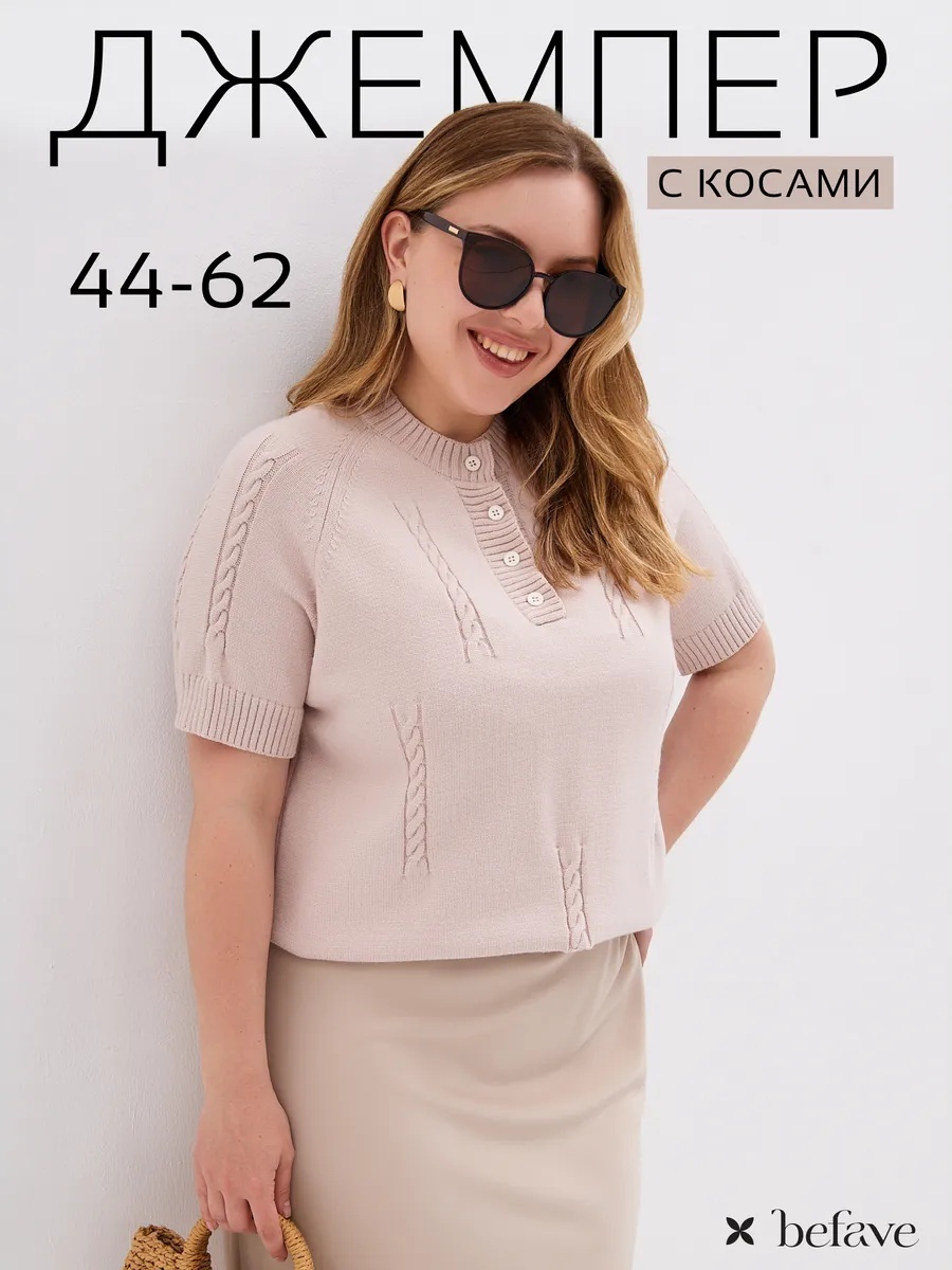 Этот джемпер с изящным узором "косичка" – прекрасный пример того, как базовая вещь может стать основой стильного образа. Свободный крой оверсайз мягко облегает фигуру, создавая элегантный силуэт без лишнего объема. Короткий рукав и ворот на пуговицах добавляют модели женственности и делают её универсальной для разных сезонов. Нежные розовый и бежевый оттенки гармонично смотрятся на плюс сайз фигуре, визуально вытягивая силуэт и добавляя образу лёгкости.