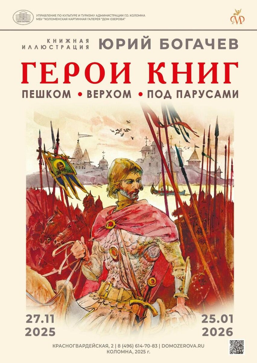 Выставка книжной иллюстрации Юрия Богачёва в Коломне. 27 ноября в 16:00 в Коломенской картинной галерее"Дом Озерова" откроется выставка "Герои книг. Пешком, верхом, под парусами" члена Союза художников России Юрия Богачёва. На выставке представлены оригиналы иллюстраций к произведениям русской и зарубежной приключенческой литературы, включая "Слово о полку Игореве", "Дон Кихота", "Робинзона Крузо" и "Остров сокровищ". Работы Богачёва отличают динамичная композиция и эмоциональность. Художник создаёт иллюстрации, доверяя воображению ребёнка. Юрий Богачёв – член Союза художников и журналистов России, оформил более 70 книг. Его работы находятся в государственных музеях. Выставка продлится до 25 января 2026 года. Адрес: Коломна, Красногвардейская ул., д. 2