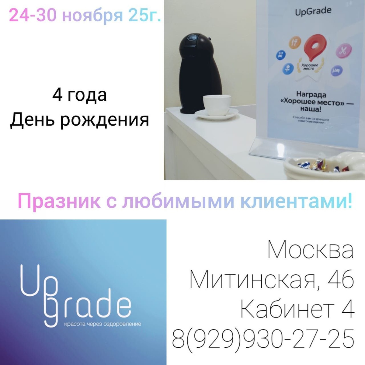Проекту студия 💜 UpGrade💙 4 года Да, да - в ноябре 2021 года открыла двери🤗 небольшая и уютная студия по уходу за телом. Открытие пришлось на период самых жестоких мер по карантину Covid. Казалось бы не вовремя ❌ Но формат кабинета: ✓ по приему 1 человека в студии как и положено в карантин, ✓ выполнение оздоровительных услуг клиентам, пережившим все штампы коронавируса на себе ✓ привести себя в шикарную форму, благодаря широкому спектру услуг для тела и лица дали возможность легко, комфортно, под релакс музыку позаботиться о своем здоровье и красоте ♥️💆 За 1461 день работы 📅 студии студию посетили боле 400 клиентов 🧑🤝🧑 оставив множество искренних отзывов 📝 о работе мастеров студии💜 Искренне благодарим за доверие, отзывы и выбор студии для оздоровления и красоты вашего тела 💞 Ждём наших клиентов 🤗 с 24 по 30 ноября 25г в гости - праздник с любимыми клиентами - лучший способ отпраздновать день рождения 💙 Презенты 🎁 Угощения 🍰Поздравления💌 День рождения 💜 UpGra