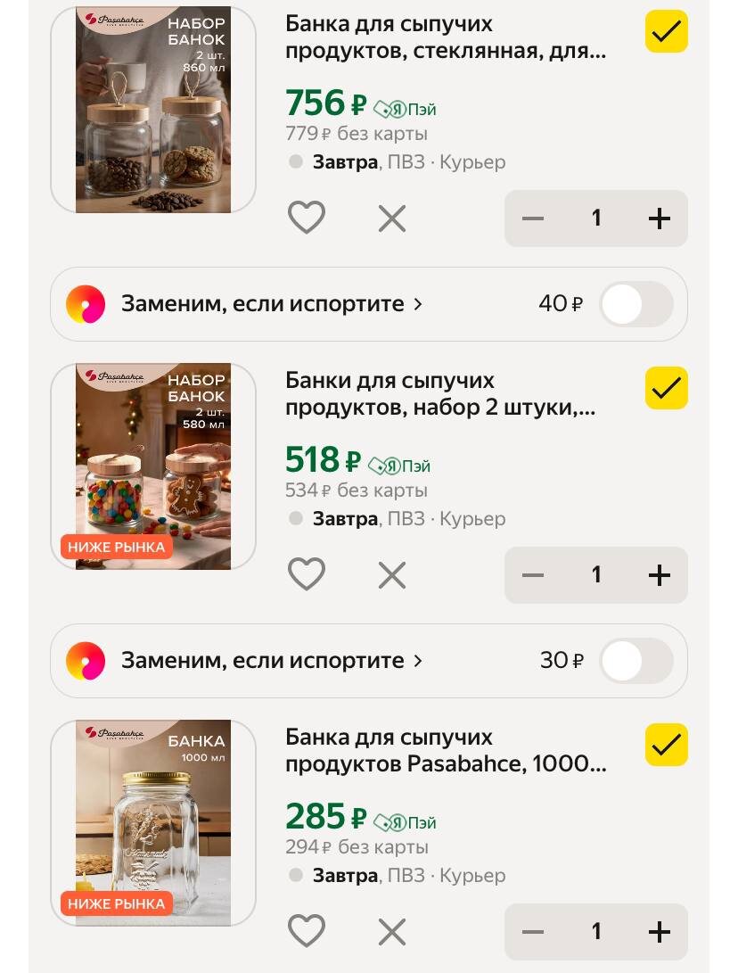 1⃣Банка для сыпучих продуктов, стеклянная, для хранения, с бамбуковой крышкой 860 мл, Pasabahce, набор 2 шт. https://market.yandex.ru/cc/85VzjF 2⃣Банки для сыпучих продуктов, набор 2 штуки, Pasabahce Woody, 575 мл, с бамбуковыми крышками https://market.yandex.ru/cc/85W27Q 3⃣Банка для сыпучих продуктов Pasabahce, 1000 мл, с крышкой, прозрачная https://market.yandex.ru/cc/85W2bk ✅ Подписаться 🔣 Бот с промокодами