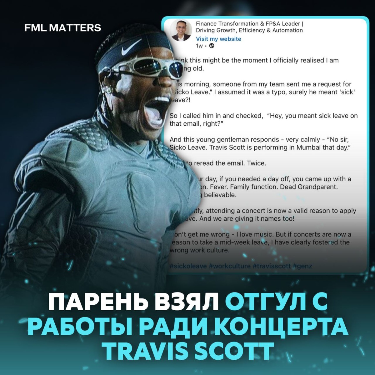 ❗️ ПАРЕНЬ ВЗЯЛ ОТГУЛ РАДИ КОНЦЕРТА TRAVIS SCOTT! Работник одной компании отправил боссу письмо с просьбой дать ему «Sicko Leave» — особый отгул ради шоу Трэвиса. Начальник сначала решил, что речь о «sick leave» (больничном), но сотрудник уверенно объяснил: «Нет, сэр, именно Sicko Leave. Трэвис Скотт сегодня выступает в Мумбаи». Начальнику пришлось дважды перечитать письмо, после чего он признался, что раньше люди придумывали серьёзные причины для отгула, а теперь концерт стал вполне «уважительной». В итоге начальник всё-таки отпустил фаната. +реп боссу 😎 💀 FML MATTERS