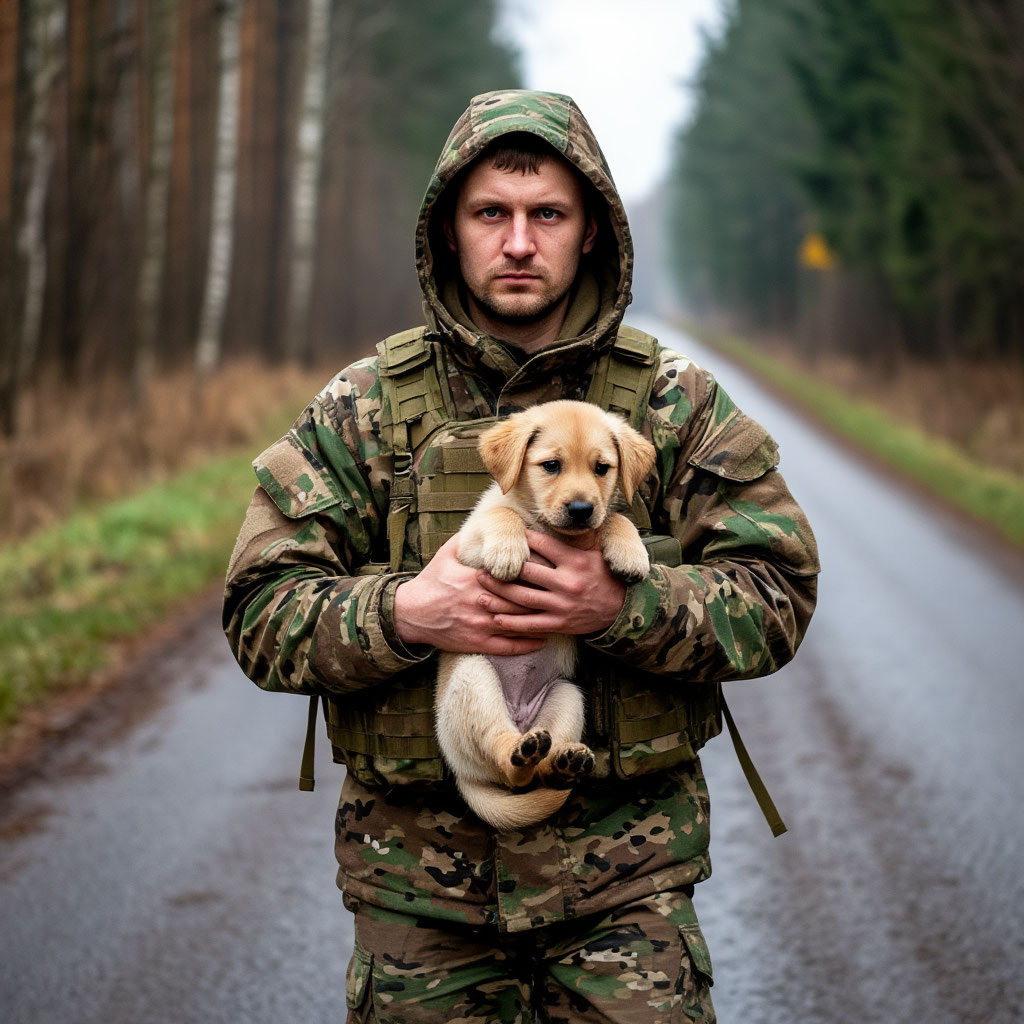 Костя опустился на колени в липкую, глинистую грязь, и поднял малыша осторожно, ощущая его почти невесомую хрупкость. Щенок был неожиданно тёплым и слабым, его мягкая шёрстка мокрой от запекшейся крови и местами покрыта комьями грязи. Глаза едва открывались, тонкие веки дрожали, и в них не было страха, только невыносимая, древняя усталость, как будто он уже прожил целую жизнь.