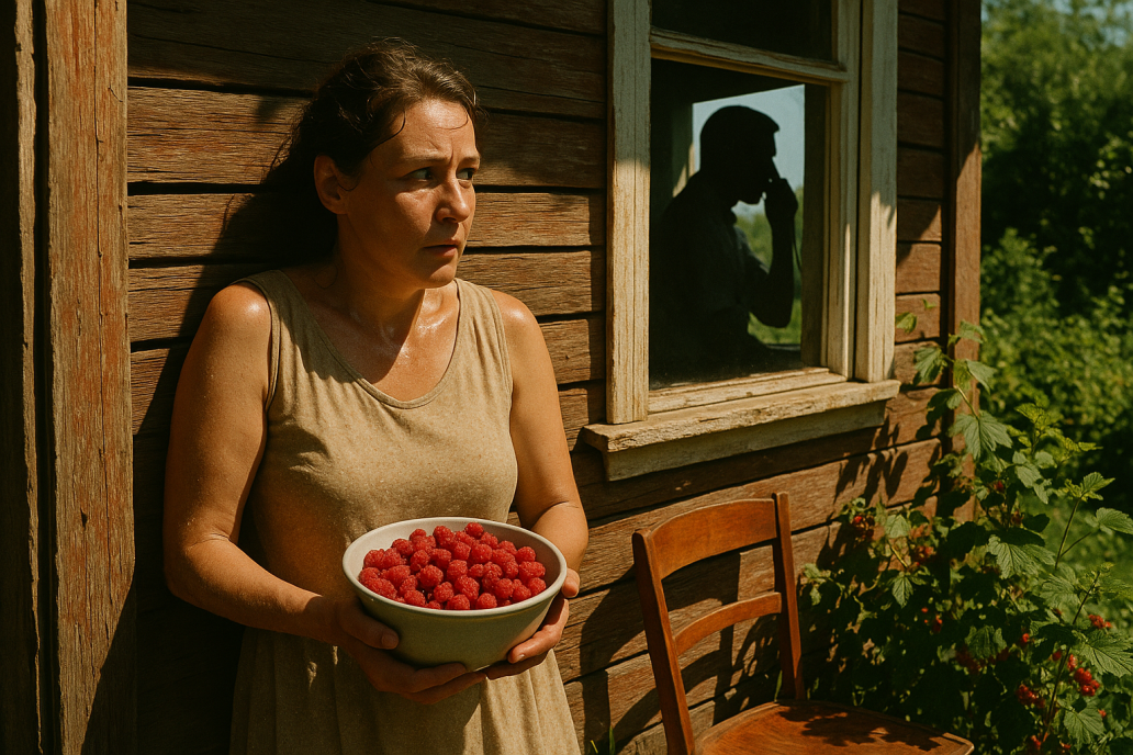 Лена стояла за старым, почерневшим от дождей сараем. В руках у неё был эмалированный бидончик, наполовину полный малины. Ягоды были крупными, но некоторые уже потекли от жары.