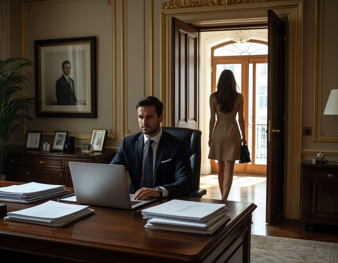 Она стояла ещё мгновение, будто давая себе последний шанс передумать, оглядеться, найти хоть что‑то, за что можно было бы зацепиться. Но вокруг не было ничего, кроме холодного порядка кабинета, строгого света и двух бокалов, так и оставшихся нетронутыми.