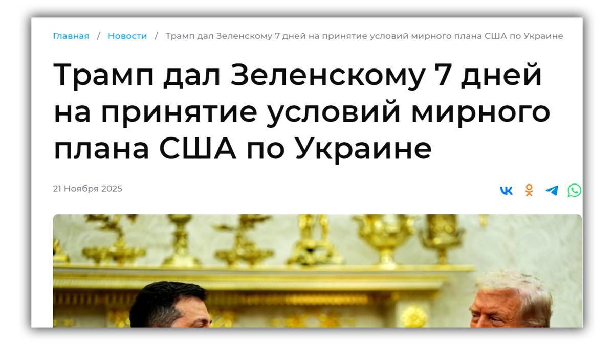 И всё это на столько серьёзно, что Трамп Зеленскому по сути выдвинул ультиматум: "Ты либо его выполняй,либо тебе будет совсем плохо. Дедлайн - 27 ноября 2025 года".
