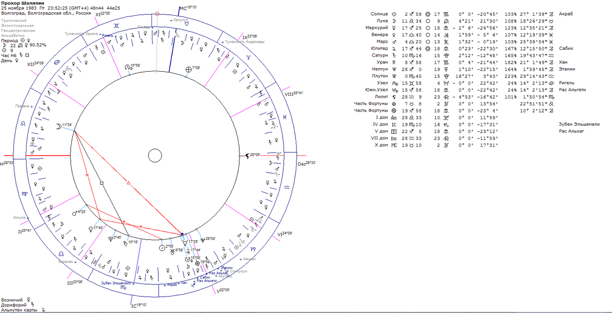 А вот если сдвинуть время примерно на 23:50 25 ноября 1983 года, г. Волгоград, +4 GMT, тогда Асцендент уходит в последние градусы Льва, и тут-то карта и начинает складываться с жизнью. Светило секты в I доме во Льве — слава и публичность, любовь публики (масса позитивных комментариев на его счет, в т.ч. от тех, кто с ним знаком в реале), плюс он много говорил, какой он эмпат и с людей считывает их общий вайб при личном контакте, а это больше говорит в пользу Луны в I доме (я смотрю по целым знакам), чем Меркурия в IV. Женщины-покровительницы, опять же, которые якобы миллионерши и миллиардерши (но на самом деле нет), как часть образа. Он сказал забавную фразу: "Я на шоу прихожу, там как будто сам с собой поговорил и ушел".