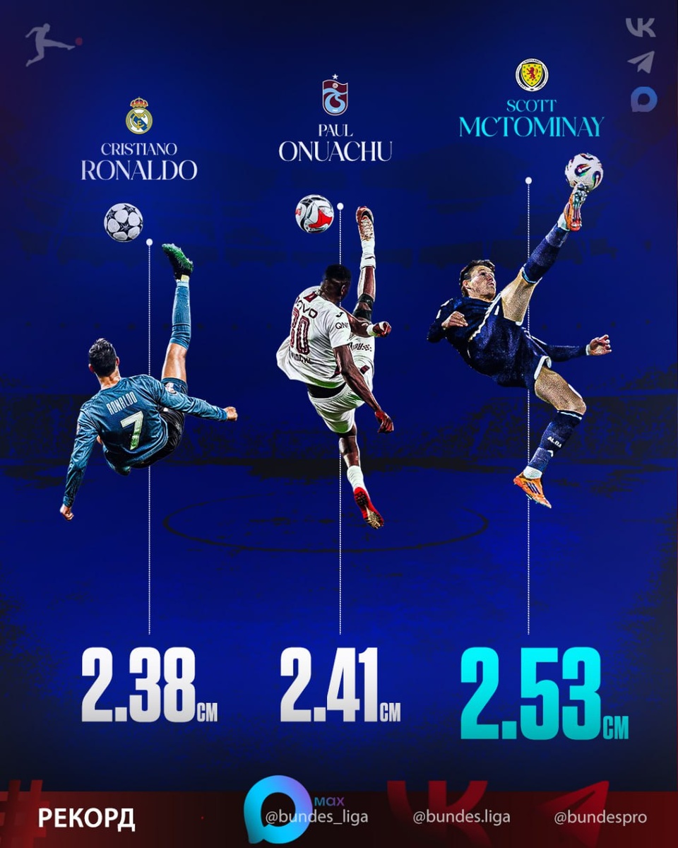 🏅 МИРОВОЙ РЕКОРД! Летучий шотландец! 👏 Скотт МакТоминей превзошел Пола Онуачу и Криштиану Роналду... и зафиксировал самый высокий гол «бисиклетой» в истории футбола. Никто не выпрыгивал на высоту в два метра и 53 сантиметра, чтобы пробить «бисиклетой» ⚽️🤯 ⭐️ MAX -❤ Телеграм - ✅️Вконтакте