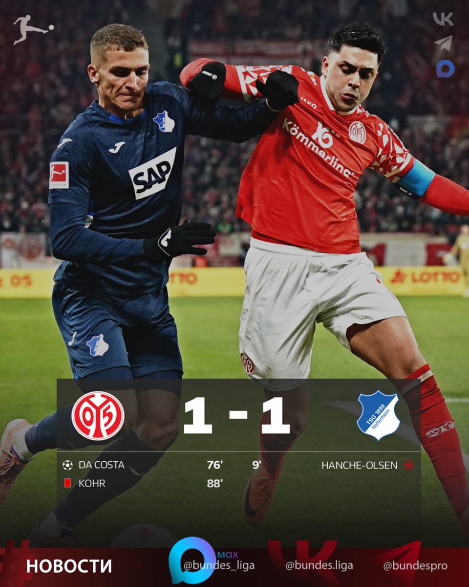 #Бундеслига ⚽️ 11 тур. «Майнц 05» - «Хоффенхайм» 1:1 ⚽️ 09' Андреас Ханче-Ольсен (авт.) (0:1) ⚽️ 76' Данни да Коста (1:1) ⚡️Боевая ничья в стартовом матче 11-го тура немецкой Бундеслиги. «Майнц 05» сохранился на 17-том месте, набрав 6-ое очко в 11 играх, а «Хоффенхайм» догнал по очкам (20) идущий пятым «Байер 04». ⭐️ MAX -❤ Телеграм - ✅️Вконтакте