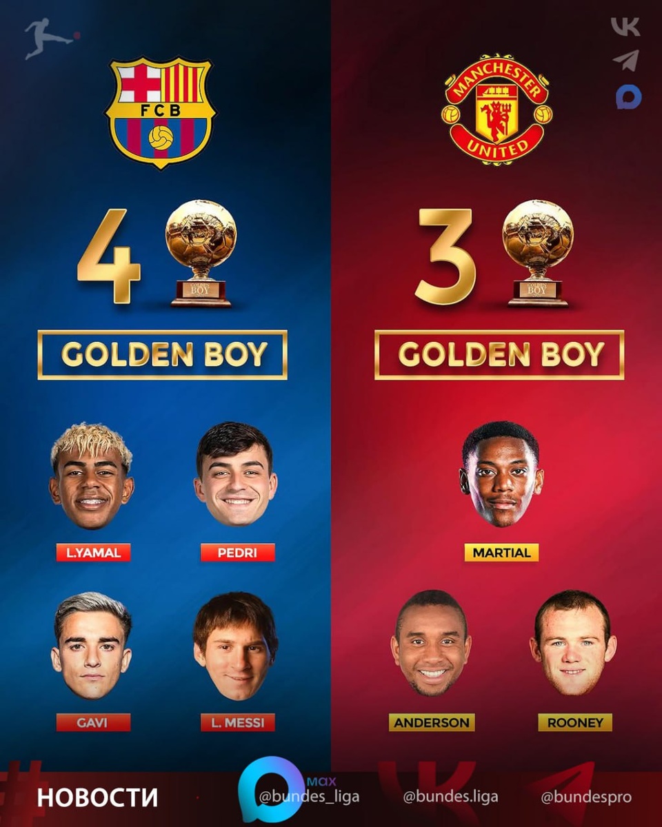 Клубы с двумя и более обладателями Golden Boy 🏆🥇 Премия Golden Boy, учрежденная в 2003 году итальянским изданием Tuttosport, вручается лучшему футболисту в возрасте до 21 года, выступающему в Европе. Больше всего обладателей премии у испанской "Барселоны" (4), в тройке по три представителя - МЮ и Боруссия Д 💪 ⭐️ MAX -❤ Телеграм - ✅️Вконтакте