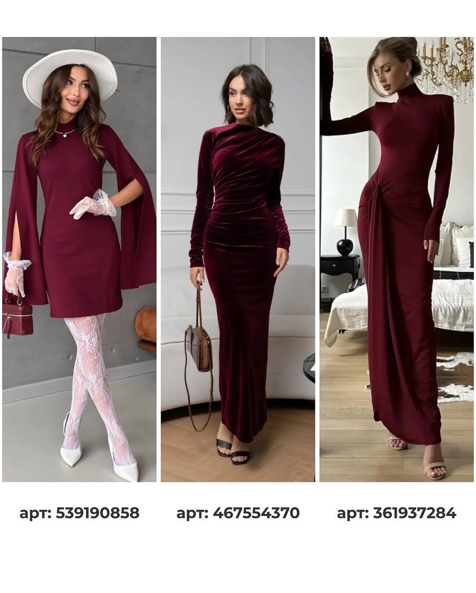 Эта подборка объединяет две роскошные палитры — бордовую и чёрную. Обе они раскрывают насыщенность, глубину и истинную вечернюю эстетику. Каждое платье из подборки — это продуманная форма, элегантный силуэт и идеальный баланс фактур.