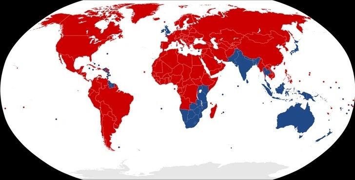 Если бы инопланетянин взглянул на эту карту, он бы подумал, что человечество разделилось по какому-то религиозному признаку. 66% населения планеты — праворульные (красные на карте), 34% — леворульные (синие). Но дьявол, как всегда, в деталях, а истина — в исключениях.