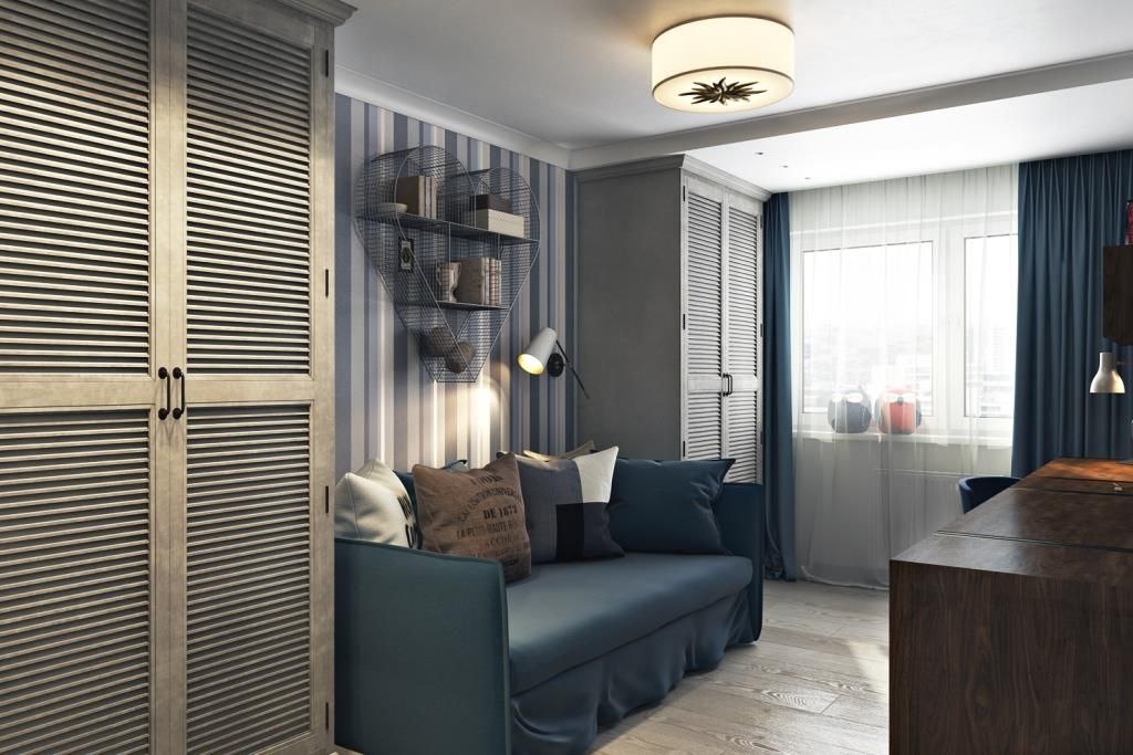 Стильное колористическое решение. Тёплые оттенки серого и холодного, насыщенно синего, наполнили комнату легкой патиной и духом истории.