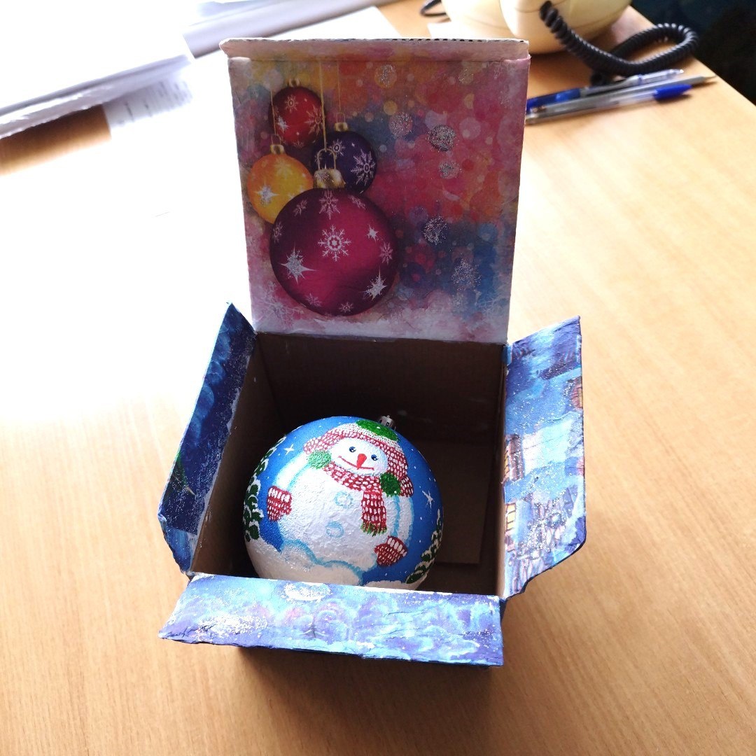 Сделала шар из ваты и расписала его и заказчица попросила упаковку. Вот такая коробочка у меня получилась, но еще не высох верх (после высыхания поверхность станет гладкой), но она торопилась и пришлось фотографировать как есть. Симпатично получилось из двух разных салфеток, но они подошли по цветовой гамме идеально. Еще шары снизу и внутри, а верхний был заключительный, поэтому и не досох.