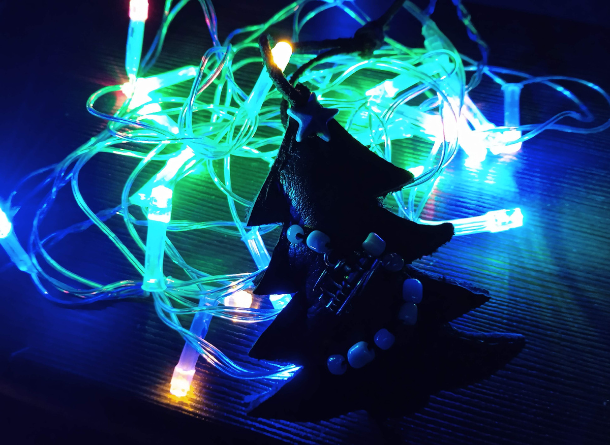 Всем привет! Новый год уже не за горами, и всем нам хочется немного чуда и волшебства. Сегодня сошьём ещё одну праздничную ёлочку из натуральной кожи своими руками и украсим её бусинами и маленьким паровозиком. Надеемся, что наш мастер-класс поможет вам сделать приятный сувенир для родных или друзей! Начнём с выкройки. Нарисуем на бумаге ёлочку нужной формы и размера и вырежем её. Перенесём выкройку на кусок натуральной кожи с лицевой стороны (для создания брелока в виде новогодней ёлочки нам понадобятся две детали). Мы взяли плотную кожу чёрного цвета. Переносить на неё выкройку удобно металлизированной гелевой ручкой, которая потом стирается без следа. Вырезаем две детали будущей ёлочки по контуру острыми ножницами. Украшаем каждую из сторон ёлочки по своему вкусу. Мы сделали гирлянды из крупных бусин белого и фиолетового цветов. На одной из сторон пришили милую деталь - маленький металлический паровозик, который сделал нашу лесную красавицу ещё душевнее. Верхушку украсили пластиково