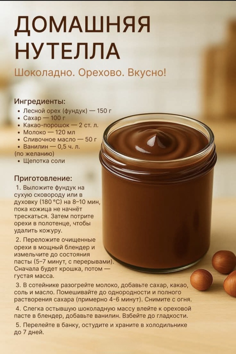 Шоколадная, ореховая, нежная — домашняя нутелла всегда получается ярче по вкусу, чем магазинная. А ещё ты точно знаешь, что в составе только нормальные продукты, без ароматизаторов и консервантов. Рассказываю проверенный рецепт, который стабильно получается густым, кремовым и очень вкусным. Ингредиенты: Фундук (лесной орех) — 150 г Сахар — 100 г Какао-порошок — 2 ст. л. Молоко — 120 мл Сливочное масло — 50 г Ванилин — 0,5 ч. л. (по желанию) Щепотка соли Как приготовить домашнюю нутеллу 1. Подготовка орехов Обжарьте фундук на сухой сковороде или в духовке при 180°C в течение 8–10 минут, пока кожица не начнёт трескаться. Пересыпьте в кухонное полотенце и хорошенько потрите — лишняя кожура уйдёт сама. 2. Делаем ореховую пасту Переложите очищенные орехи в мощный блендер. Измельчайте 5–7 минут, делая паузы. Сначала будет крошка → потом влажная масса → и в итоге получится настоящая ореховая паста. 3. Готовим шоколадную основу В сотейнике подогрейте молоко. Добавьте сахар,