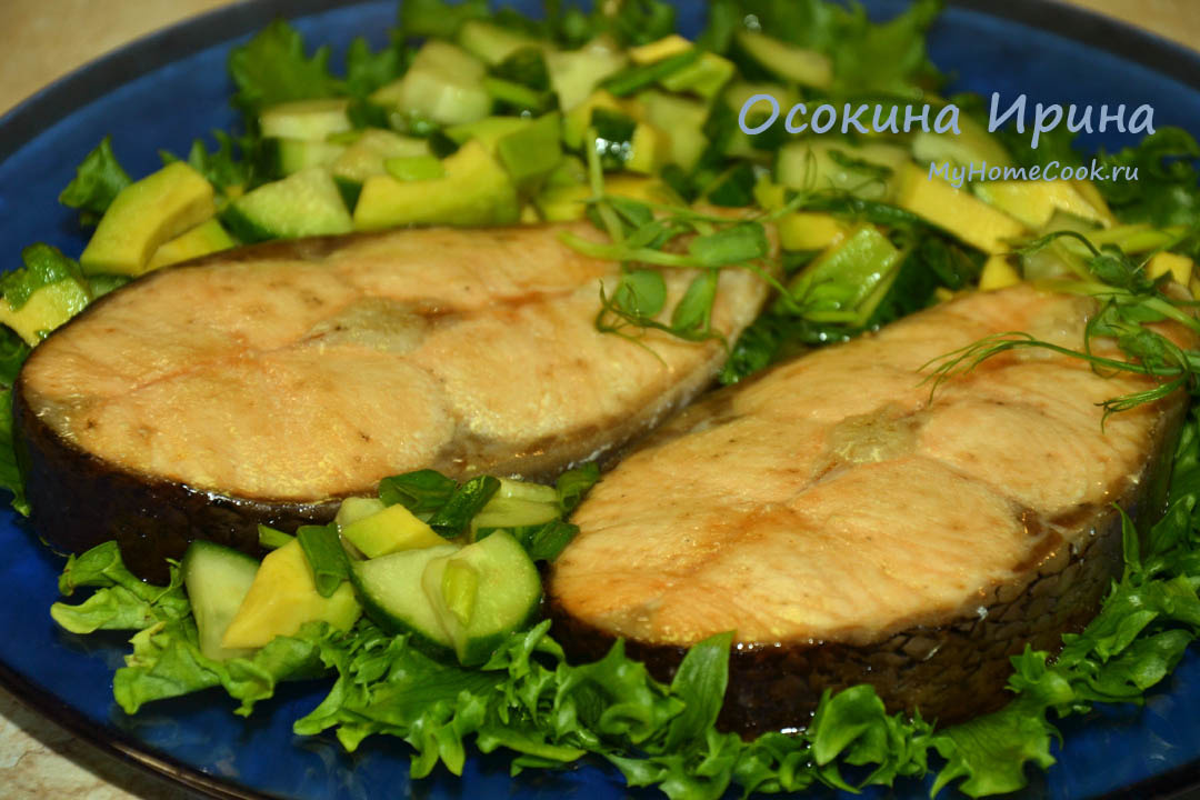Стейки сёмги обмазала кунжутным маслом, посолила, оставила на 20 минут подмариноваться, затем переложила в форму и запекла в духовке, разогретой до 180 градусов, в течение 7 минут. В это время в пиалке смешала 1 ст.л. мёда и 1 ч.л. соевого соуса, промешала, затем добавила 1/2 ч.л. кукурузного крахмала, снова промешала и прогрела всё в микроволновке 30 секунд. Достала форму из духовки, смазала рыбу подготовленной глазурью и вернула в духовку ещё на 7 - 8 минут. На гарнир подала салатик для которого в миске смешала по 1 ст.л. кунжутного масла и рисового уксуса, добавила по 1 ч.л. соевого соуса, дижонской горчицы и сока лайма, промешала всё до однородности, добавила 2 резаных огурца и 1 авокадо, промешала, добавила большую горсть резаного зелёного лука и ещё раз промешала. Очень интересно и вкусно получилось) Приятного аппетита