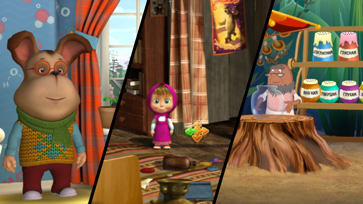 Что развивает: речь, чтение, звукобуквенный анализ Заставка Это простая, яркая и очень спокойная обучающая игра. Вместе с Лунтиком ребёнок учится отличать буквы, составлять слоги, находить правильные картинки и постепенно осваивать основы русского языка. Разбор бук Самое важное - игра даёт задания в мягкой форме, не ругает, не давит и не «гонит» ребёнка вперёд. Можно проходить в своём темпе, а повторение закрепляет материал. 2. “Маша и Медведь: Подготовка к школе” Возраст: 4–7 лет