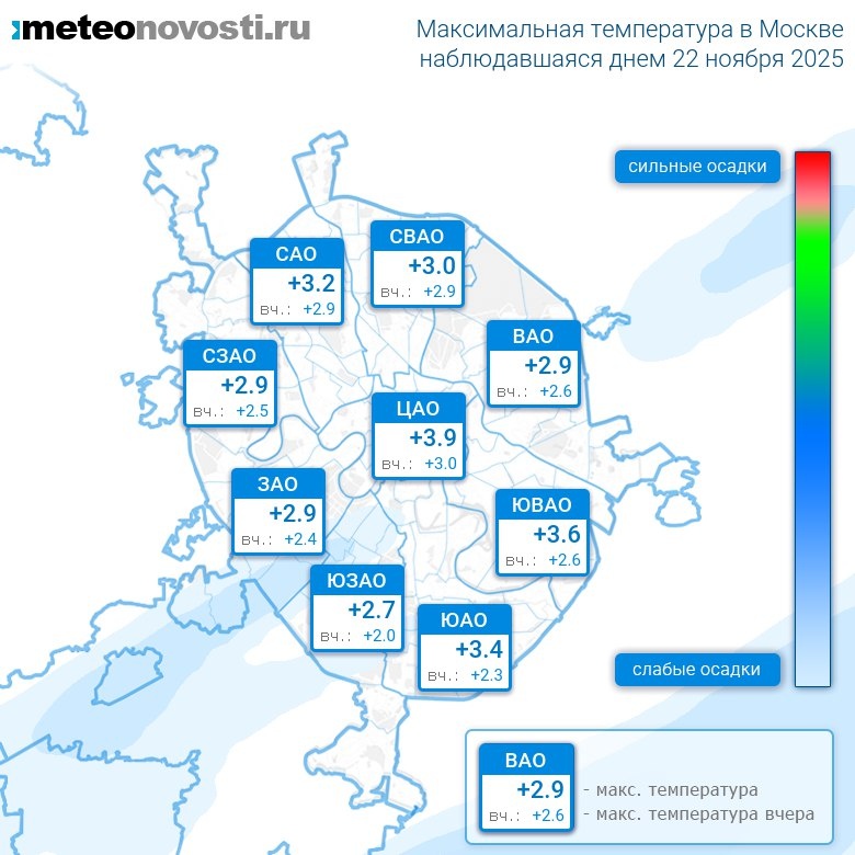 #за12часов #день Прошедший день 22 ноября был на 0.2°C теплее вчерашнего. Максимальная температура днём в Москве оказалась на 2.8°C выше нормы, что в пределах обычных значений. Самая высокая температура +3.9°C была зафиксирована в 19 часов в центре города, а холоднее всего было на юго-западе: +1.8°C. Разница по максимальной температуре в разных частях столицы составила за день 2.1°C. Максимальные порывы ветра днём достигали 3 м/с. Атмосферное давление за день повысилось с 749 до 751 мм.рт.ст. Было без существенных осадков Самый теплый день в Москве 22 ноября был в 2024 году, когда максимальная температура составила +9.5°C, а холодный в 1987 году: -14.1°C. Перейти на сайт Прогноз погоды на 14 дней