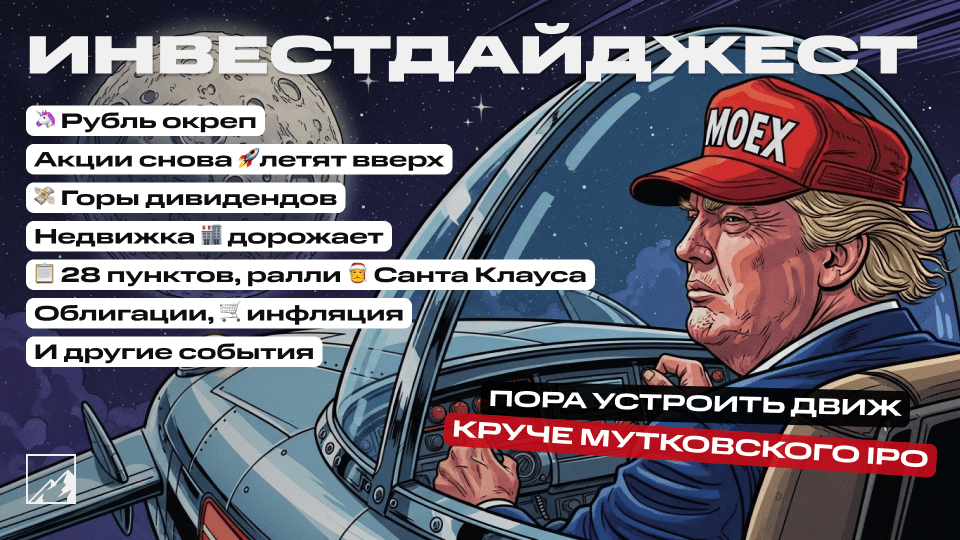 Неделя получилась богатой на события. Дивиденды до 60%, 28 пунктов по урегулированию конфликта, замедление инфляции — далеко не все события, которые произошли. А ещё и Мутко провёл топовое IPO, теперь можно купить акции Дом РФ дешевле. Вы тоже топовые, ловите свежий дайджест. Это легендарный еженедельный дайджест, который выходит в моём телеграм-канале, на который приглашаю обязательно подписаться, чтобы ничего не пропускать, там много топового контента. Предыдущий выпуск: Эксперты опять ошиблись! Изменение за неделю: 80,85 → 79,10 ₽ за доллар (курс ЦБ 81,12 → 79,02). Юань 11,37 → 11,09 (ЦБ 11,40 → 11,05). Укрепление произошло на фоне новостей о прекращении конфликта. После попытки пробить дно акции узнали о возобновлении мирного трека и полетели немного вверх. Итоговое изменение IMOEX с 2 514 до 2 685. Снова позитивные ожидания по урегулированию конфликта, но пока нельзя сказать, что инвесторы воспринимают это очень серьёзно. РТС: 995→ 1 070. Недолго плавали ниже 1 000! Трамп натвити