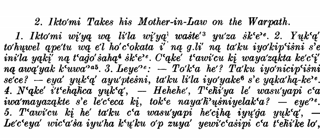 4. В норме у Дакота принято правило строго избегать общения зятьев с тещами и тестями, и снох со свекрами и свекровями, и оно еще строже, если речь о противоположных полах. Но неудивительно, что Икто́ пытается его нарушить. Он аморален во всем. Вне связи с контекстом его аморальности, фраза, переданная в переводе как "О нет!... Хотя... ладно", с существенными паузами между словами, в Дакотской речи могла бы означать постепенное изменение отношения говорящего к предмету.