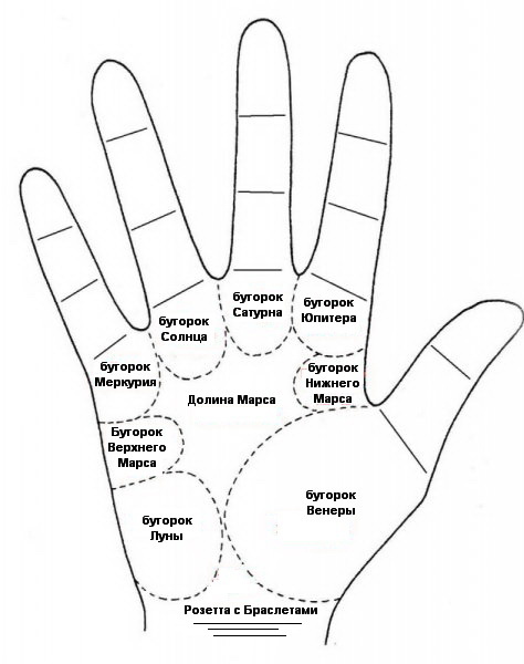 в направлении Верхнего Бугорка Марса – развитое воображение, страсть к гармонии в направлении Розетты Браслетов – дикие необузданные страсти в направлении Бугорка Венеры – воображение вызывающее эмоциональное возбуждение в направлении внутренней части Ладони – эмоции подстёгивающие агрессивное поведение