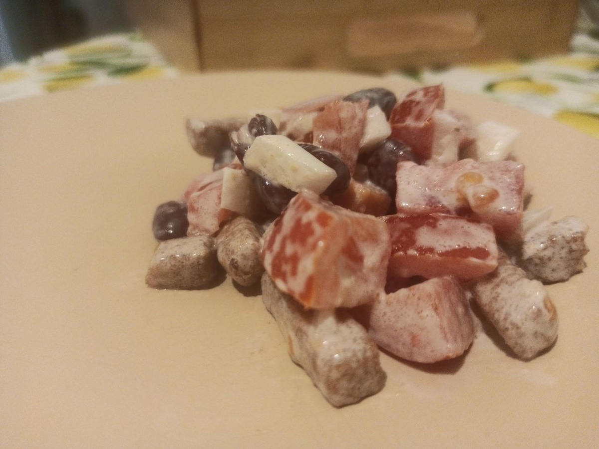 Этот салат не из тех, что можно съесть на ночь. Это олдскульный майонезный салат, сытный и очень вкусный. Много лет назад попробовала его на дне рождения у подруги. Она сказала, что называется он "Любимый". Теперь и я его так называю. Готовится быстро, просто, а получается очень вкусно. Помидоры - 3 шт. Сухарики - 1 пачка Фасоль консервированная - 1 банка Колбаса (сервелат) - 250 г Лук репчатый - 1 маленькая головка или половина крупной Майонез. Нарезаем помидоры кубиками и кладем в салатник. Отправляем к ним сухарики. Если слишком крупные, можно их помять, поломать. Идеально вписываются со вкусом колбасы, сыра, шашлыка. Колбасу нарезаем соломкой. Я особо не мельчу. Нарезаем лук. Затем промываю фасоль и добавляю к остальным компонентам. Можно немного посолить, но помним, что сухарики и колбаса у нас тоже соленые. Добавляем майонез и все хорошенько перемешиваем. Отправляем наш салат на несколько часов в холодильник, чтобы сухарики пропитались майонезом и стали мягче, а все ингредиенты п