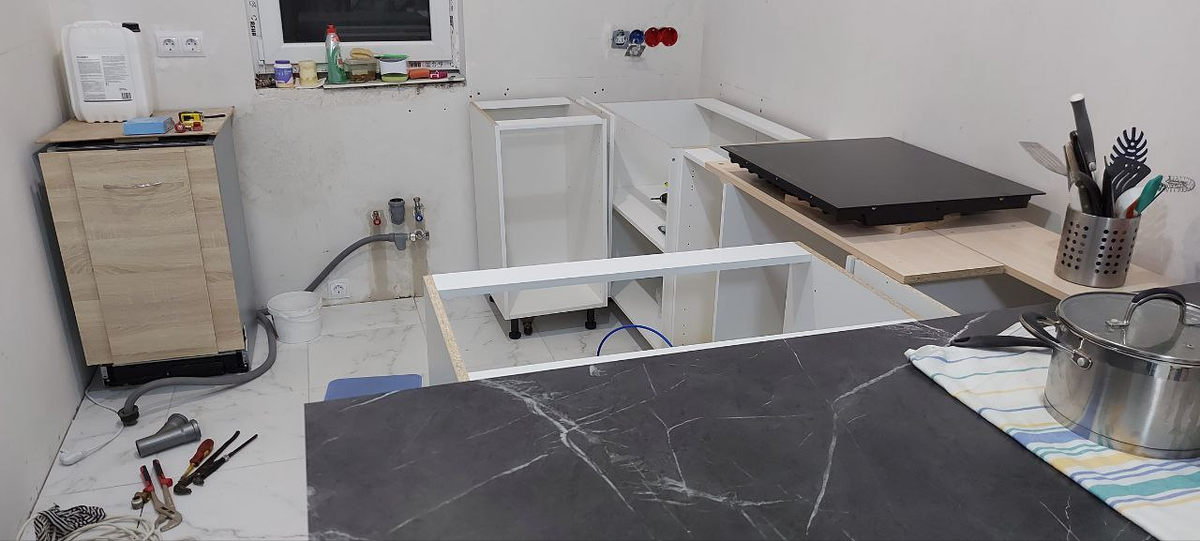 Здравствуйте, друзья! Нижний ряд шкафов кухни мы скомплектовали, столешницу и кухонную мойку купили. Всё расставили согласно новому проекту кухни. Теперь стало всё видно, как и где будет располагаться. Из-за ошибки в 5 см в первоначальном проекте пришлось изменить расположение нижних шкафов. Убрали узкий шкаф на 15 см, и пустоту в 5 см будем закрывать фальшпанелью. В результате кухонная мойка немного сместилась, на 10 см, и сделанные ранее выводы для подключения канализации и воды оказались не по центру. Хорошо, что мойка и шкаф под нее большие, 80 см, и все выводы оказались внутри этого шкафа. Долбить стены и переносить ничего не понадобилось, подключу всё как есть. Для удобства вывел отдельный кран для подключения посудомоечной машины, всё заштукатурил и вместо заглушек установил краны. Этот узел для монтажа кухонной мойки готов. Еще я решил добавить четыре электрических розетки над столешницей. Изначально было сделано три двойных, а теперь я решил оставить одну двойную и две 4-х ро