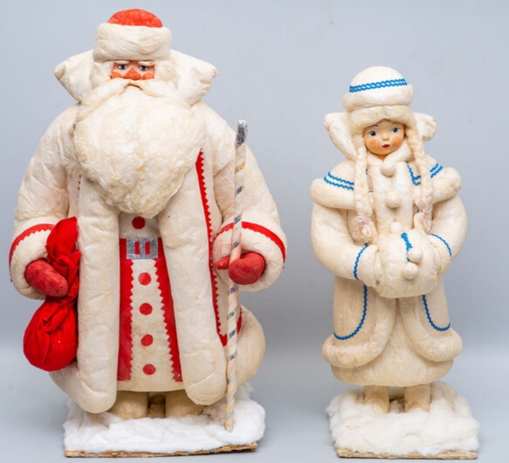 Не могу удержаться, чтобы не поделиться снимком этой дивной пары! Эти ватные игрушки – само воплощение восторга! Эти игрушки действительно вызывают трепет и восхищение мастерством исполнения. В них чувствуется не только кропотливый труд, но и душа мастера, вложившего частичку себя в каждое творение. Нашла это сокровище в интернет-закромах какого-то заморского аукциона; торги, судя по всему, гремели в 2020 году. К великому сожалению, всего одна фотография. Изрыла весь интернет вдоль и поперёк в надежде отыскать хоть что-то подобное, но тщетно. В скупой записи к лоту нашлась лишь крупица информации: местонахождение – Россия. Годы рождения этих чудесных созданий: 1960-1970. Материалы: вата, картон, роспись, микролента, фольга, ткань. Состояние – удивительная сохранность, словно время пощадило их. Вероятность того, что это уникальные экземпляры, выполненные на заказ, весьма высока. В период с 1960 по 1970 годы индивидуальные заказы на изготовление елочных игрушек были не редкостью. Масте