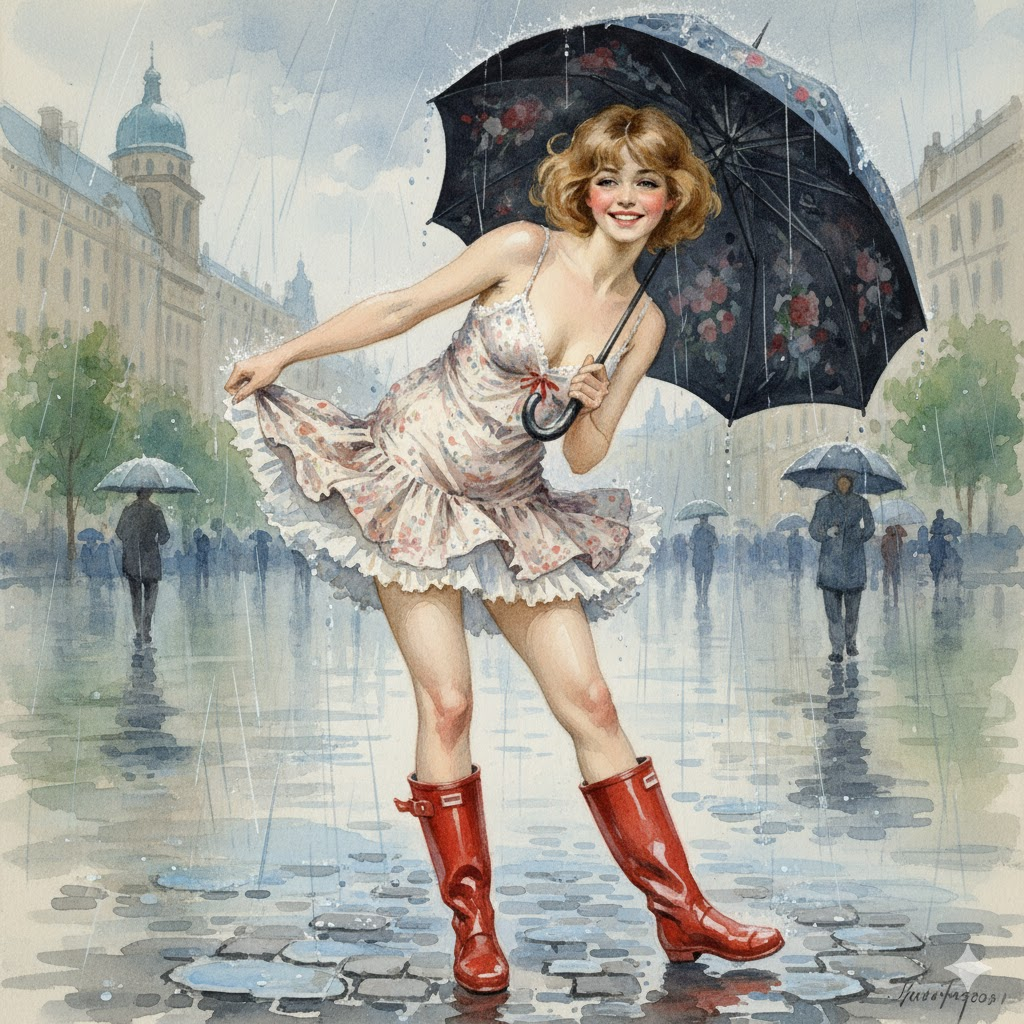 Генерируем картинки в https://gemini.google.com/ Сделаю запрос на генерацию нашей девушки в стиле конкретного художника (захотелось взять не очень известного) Watercolor drawing by Konstantin Somov of a pretty, sensual young European woman, short fluffy hair, very open mini, playful outfit, stand, energetic