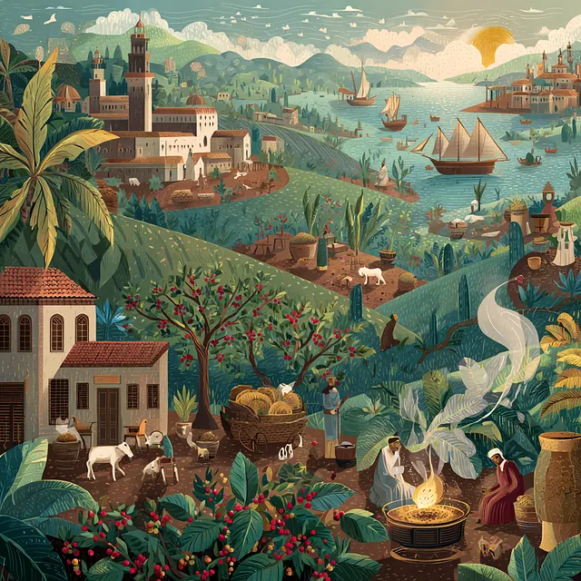 Маленькая история о кофе органично вписывается в гораздо более древнюю. На протяжении веков кофе вызывал одинаково сильные страсть и споры. Его история полна контрабанды, религии, политики — и даже периодических угроз обезглавливания. История начинается в эфиопских высокогорьях, в регионе под названием Каффа — возможно, откуда произошло слово «кофе». Дикие растения Coffea arabica росли там задолго до того, как кто-либо задумался о том, чтобы обжаривать их семена. По легенде, около 850 года нашей эры пастух по имени Калди заметил, что его козы ведут себя необычайно энергично после того, как съели красные ягоды. Мы никогда не узнаем, был ли Калди реальным человеком или это просто блестящая маркетинговая история. К XIV веку йеменские торговцы привезли растения кофе из Эфиопии через Красное море в Йемен. Первым документированным кофепьющим был шейх Джамал-ад-Дин аль-Дабхани из Аденa около 1454 года. Он и другие суфийские мистики использовали напиток, чтобы бодрствовать во время длинных ноч