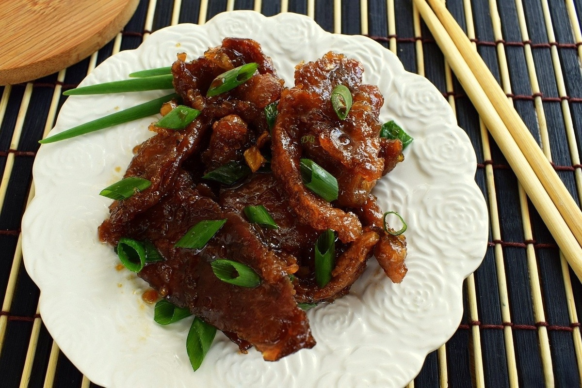 Говядина по-монгольски довольно популярна в китайских ресторанах. Да, несмотря на название, это блюдо китайской кухни. Мясо получается нежнейшее, пропитанное соевым соусом с остро-сладким привкусом.
