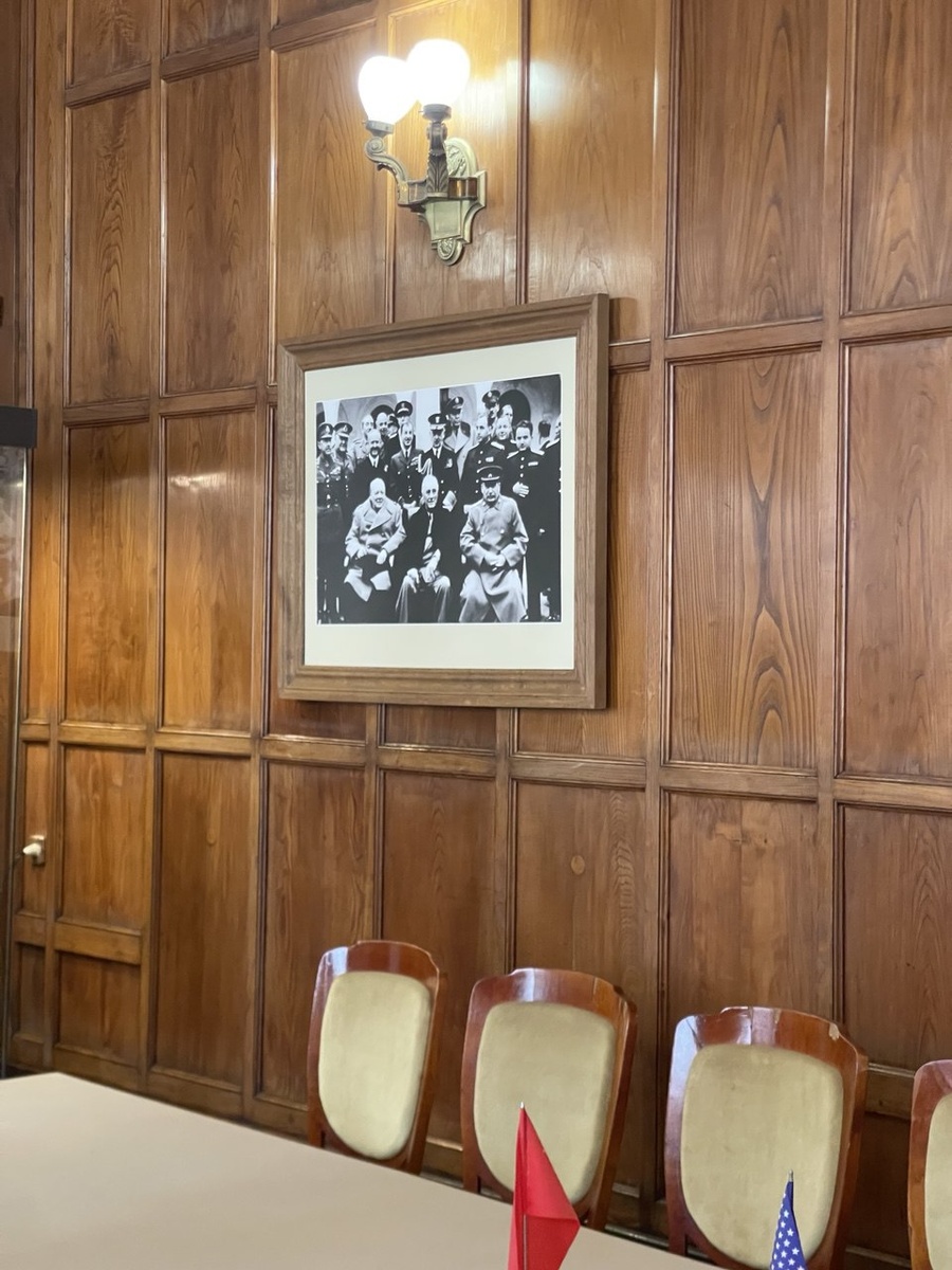 А вот тут фото, узнаете? Сделано как раз в этом патио во время Ялтинской конференции. Вот они, аркады
