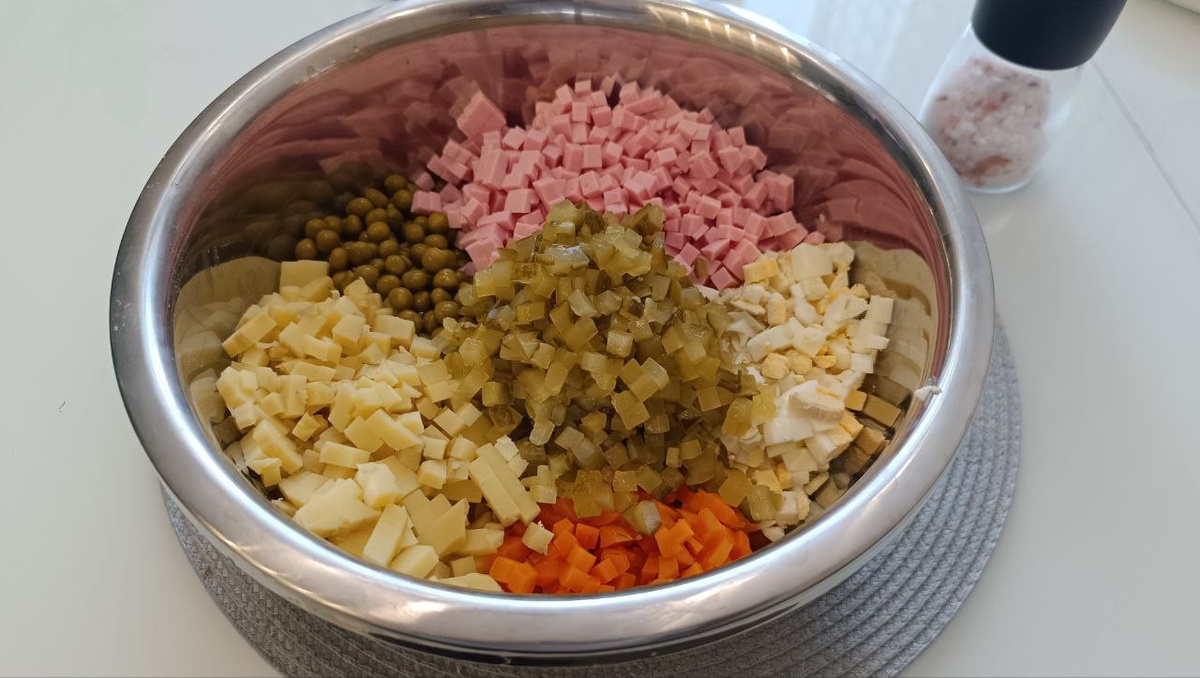 - Майонез. важный момент в приготовлении подобных салатов, ингредиенты должны быть в одинаковой нарезке. Солить этот салат до этого момента не нужно, т.к. в нём достаточно солёных составляющих (солёные огурцы и майонез). Приятного аппетита!
