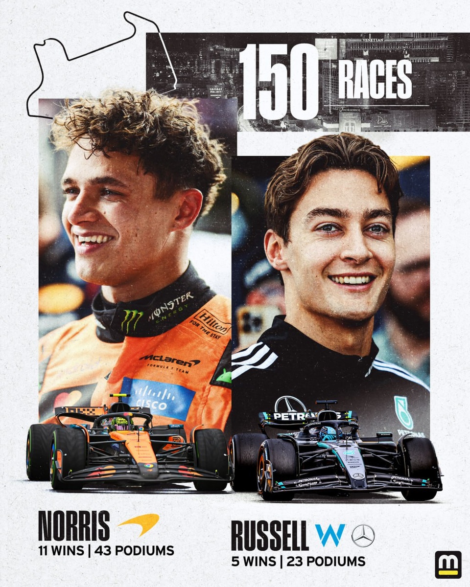 Ландо Норрис и Джородж Рассел сегодня достигнут отметки в 150 стартов Ландо за это время заработал 11 побед и 43 подиума Джордж за это же время заработал 5 побед и 23 подиума